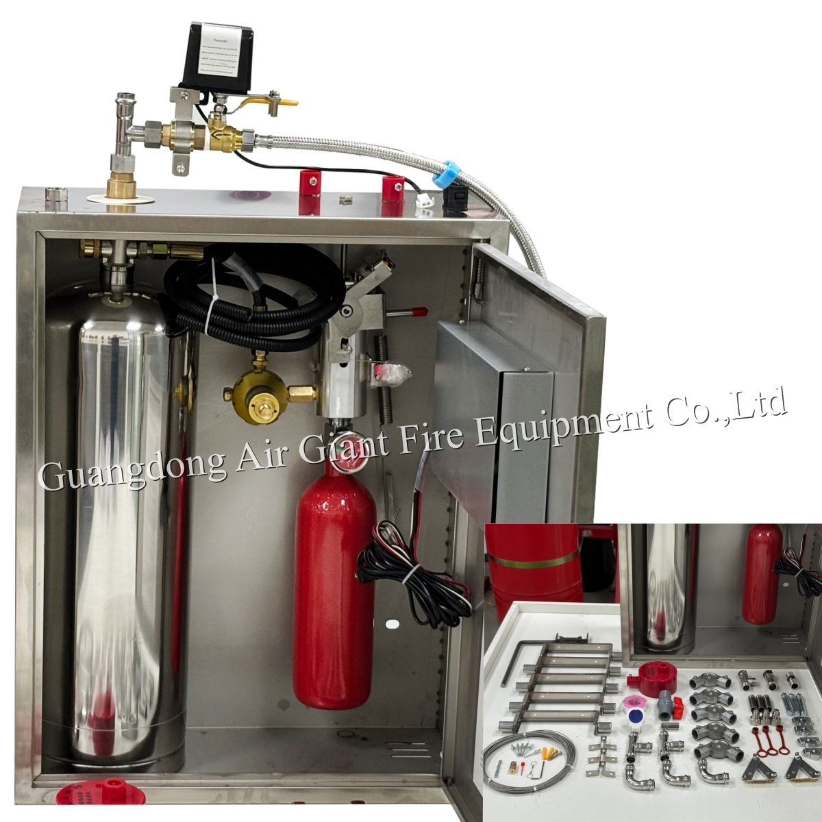 Das Feuerlöschgerät für Küchengeräte ist ein vollständiger Satz von Geräten, die in Umgebungen mit hoher Luftfeuchtigkeit und Hitze wie Industrieküchen, gewerblichen Küchen und zivilen Küchen installiert sind.einschließlich: